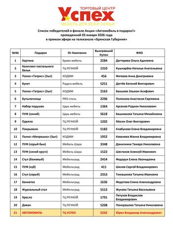 Победители могут получить подарки в администрации ТЦ Успех, с 04.01.2026г с 10.00 до 20.00 , в течении 10 дней!